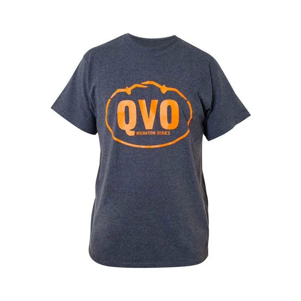 Le tee-shirt est gris foncé orné du logo de l’émission QVO Migration Series.